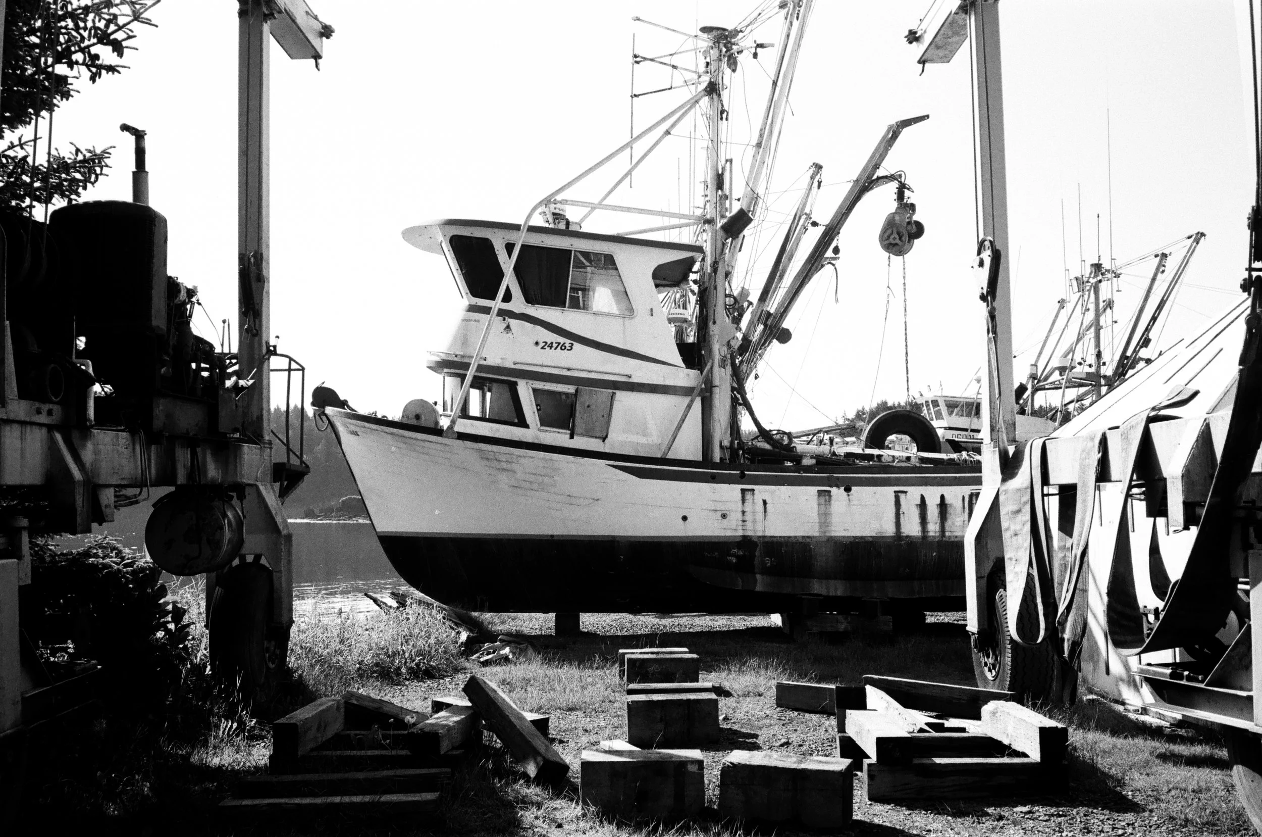 Armed with three lenses (35mm, 50mm, and 90mm) and 15 rolls of a mixed bag of black-and-white and color film, I dared myself to capture a different aspect of my Alaskan adventure. Landing in Kodiak City, I set out with my camera and film in hand, photographing old crab pots, boats, and buildings. My feet became my zoom lens, and my eyes were forever searching for light, textures, and leading lines. Using sub-framing and more, I photographed from small planes, grizzly bears in the rivers, and even toured a cannery.